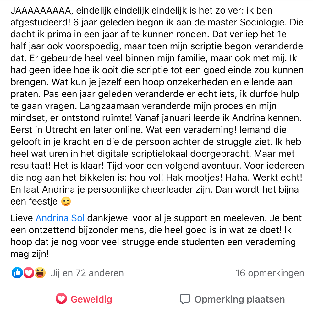 Met gepaste trots mag ik vertellen dat ik mijn scriptie met een 9 heb afgerond. Mijn dank gaat uit naar mijn fantastische begeleider [naam] die steeds bereid was mee te denken en me voorzag van uitdagende feedback.